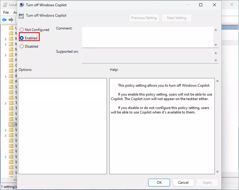 setându-l la Dezactivat sau Neconfigurat, Copilot va fi activat.