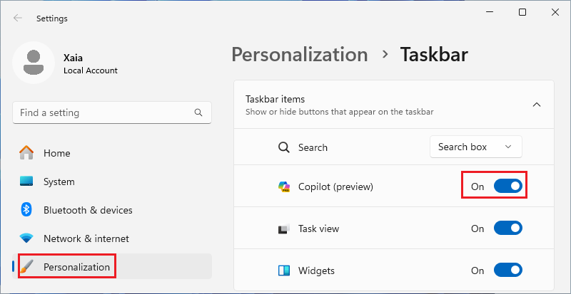 opțiune pentruCopilotul. Comutați butonul pentru a activa Copilot să apară în bara de activități.