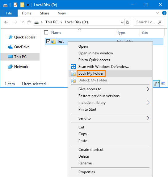 Dacă doriți să împiedicați temporar alte persoane să acceseze folderul dvs. securizat, faceți clic dreapta pe el și selectați „Blocați folderele mele” din meniul contextual și faceți-l inaccesibil. De fiecare dată când reporniți sau închideți computerul, folderul securizat se va bloca automat.