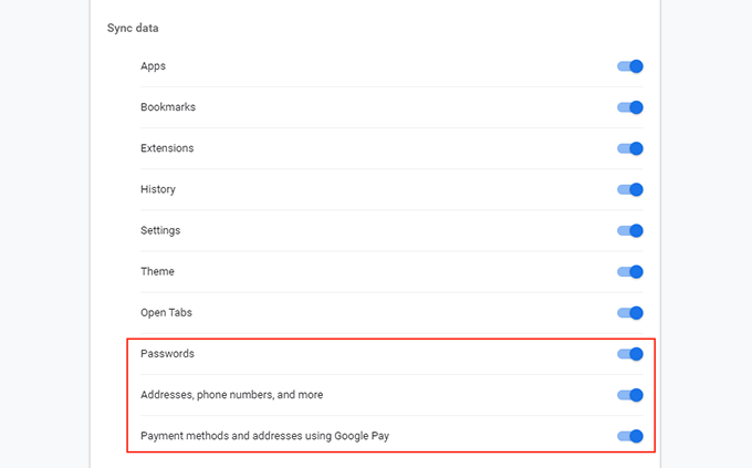 Asigurați-vă că comutatoarele de lângăParole, adrese, numere de telefon și multe altele, șiMetode și adrese de plată folosind Google Pay, sunt activate.