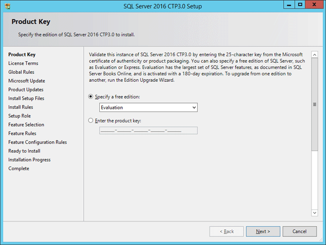 - Introduceți cheia de produs și faceți clic pe Următorul. Deoarece versiunea finală a SQL Server 2016 nu este încă lansată, deci trebuie doar să selectați ediția de evaluare.