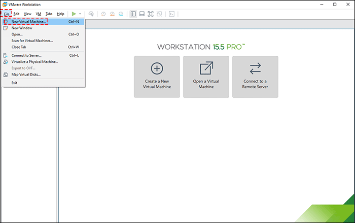 Pasul 2: Acum, trebuie să creați o nouă mașină virtuală. Deschideți VMware pe computer și faceți clic pe „Fişier” din meniul din stânga și apoi faceți clic pe „Noua masina virtuala”.
