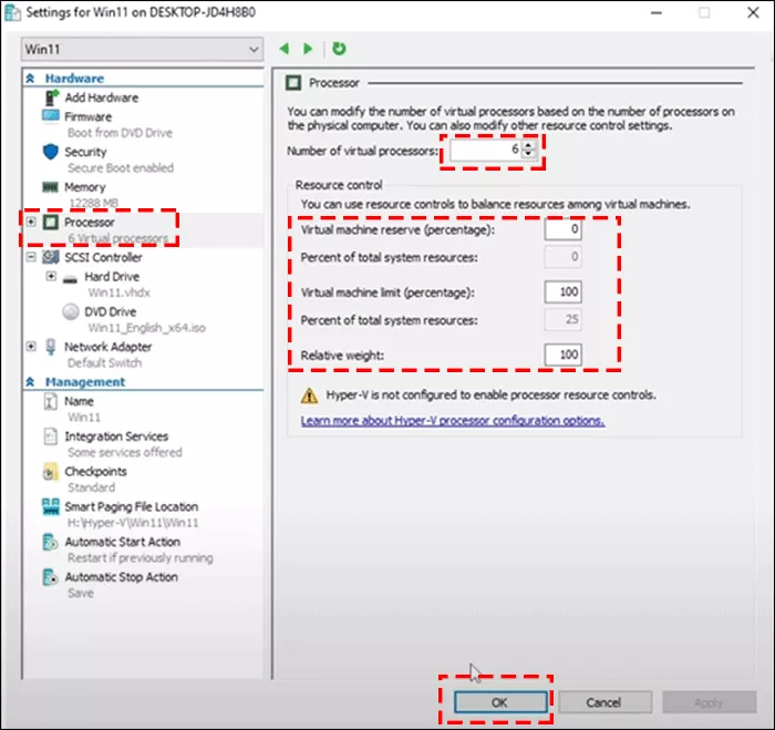 Pasul 11: Faceți clic pe „Procesor” în panoul din stânga și modificați numărul de procesoare virtuale în funcție de numărul de procesoare de pe computerul fizic. Pentru controlul resurselor, îl puteți utiliza pentru a echilibra resursele între mașinile virtuale. Apoi, faceți clic pe „Bine”.