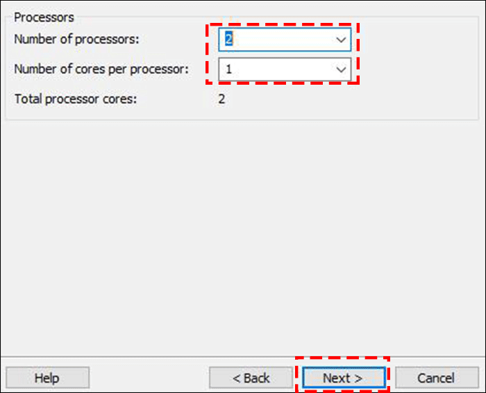 Pasul 8: Specificați configurarea procesoarelor acestei mașini virtuale și faceți clic pe „Următorul”.