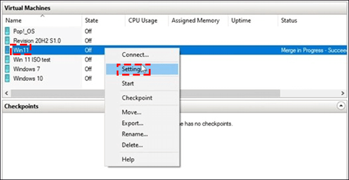 Pasul 10: Plasați mouse-ul peste mașina virtuală pe care ați creat-o și faceți clic dreapta pe „Setări”.