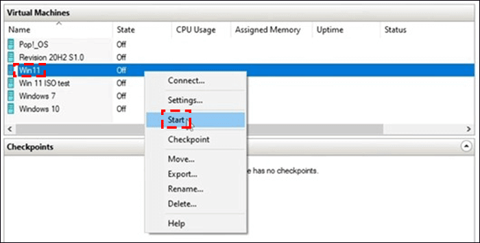 Pasul 12: Treceți din nou mouse-ul peste mașina virtuală și faceți clic dreapta pe „Început” să înceapă să alerge.