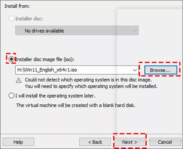 Pasul 4: Faceți clic pe „Fișier imagine disc de instalare (ISO)” și apoi faceți clic pe „Răsfoiește” pentru a selecta fișierul imagine Windows 11. După aceea, faceți clic pe „Următorul”.