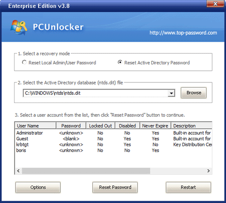 - Alegeți baza de date Active Directory NTDS.dit, aceasta va afișa o listă de conturi de utilizator de domeniu în baza de date NTDS.dit.