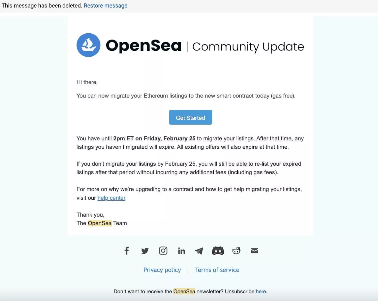 Iată un exemplu tipic de înșelătorie de tip phishing NFT. La prima vedere, pare a fi un e-mail adevărat trimis de echipa de asistență OpenSea. Vă solicită să vă migrați listele Ethereum către un nou contract inteligent și vă oferă un link corespunzător. Cu toate acestea, odată ce faceți clic pe el și completați formularul propus, acreditările dvs. vor ajunge în mâini greșite.
