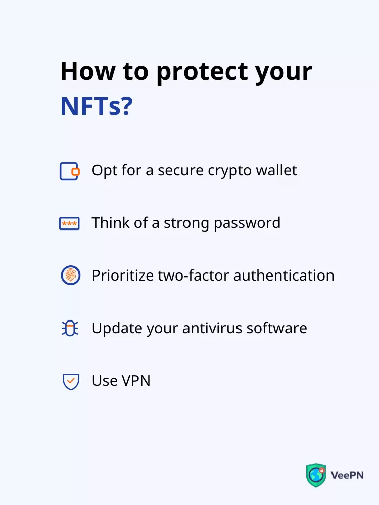 Deși soluțiile blockchain sunt relativ sigure, cumpărarea și vânzarea NFT-urilor este încă destul de riscantă. Acest lucru se datorează numeroaselor escrocherii, schemelor de investiții false și altor tehnici rău intenționate care se străduiesc să compromită securitatea utilizatorilor. Prin urmare, este o idee bună să vă protejați și să respectați cele mai eficiente măsuri de securitate. În special, puteți utiliza un VPN, puteți actualiza software-ul antivirus și puteți crea un portofel cripto de încredere.