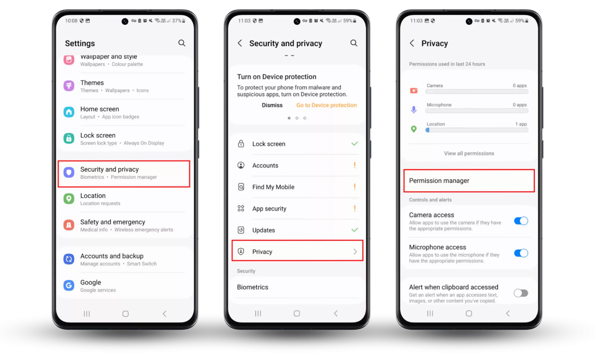 Pașii 1-2: Selectați Setări > Securitate și confidențialitate > Confidențialitate > Manager de permisiuni.