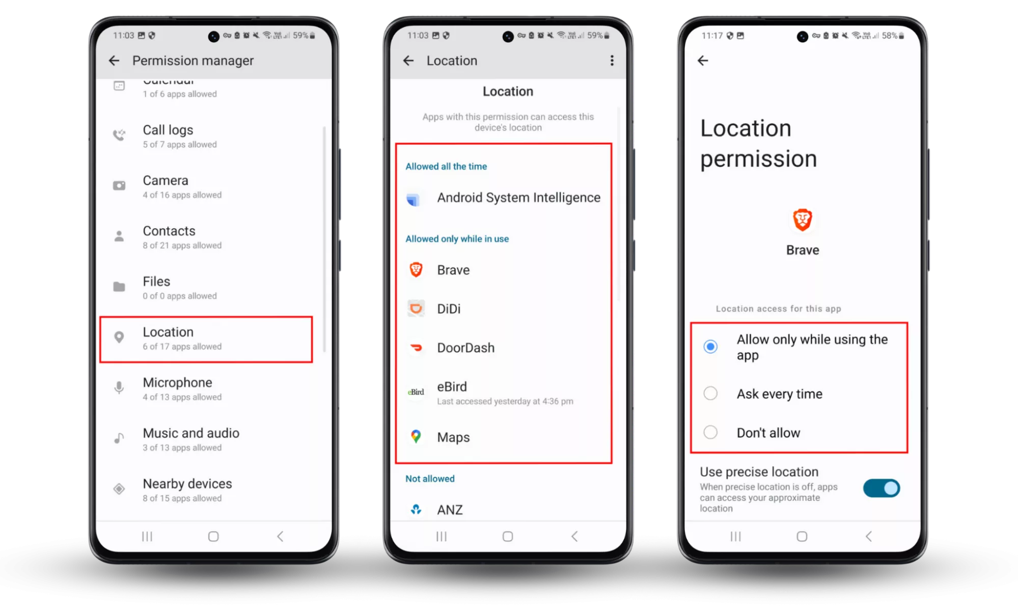 - Examinați permisiunile de locație ale fiecărei aplicații. Pentru a limita frecvența cu care aplicațiile vă accesează datele de locație, ar trebui să le setați laÎn timp ce utilizați aplicația sau widget-urilela minim. Acest lucru ar trebui să împiedice aplicațiile să vă acceseze locația în fundal.