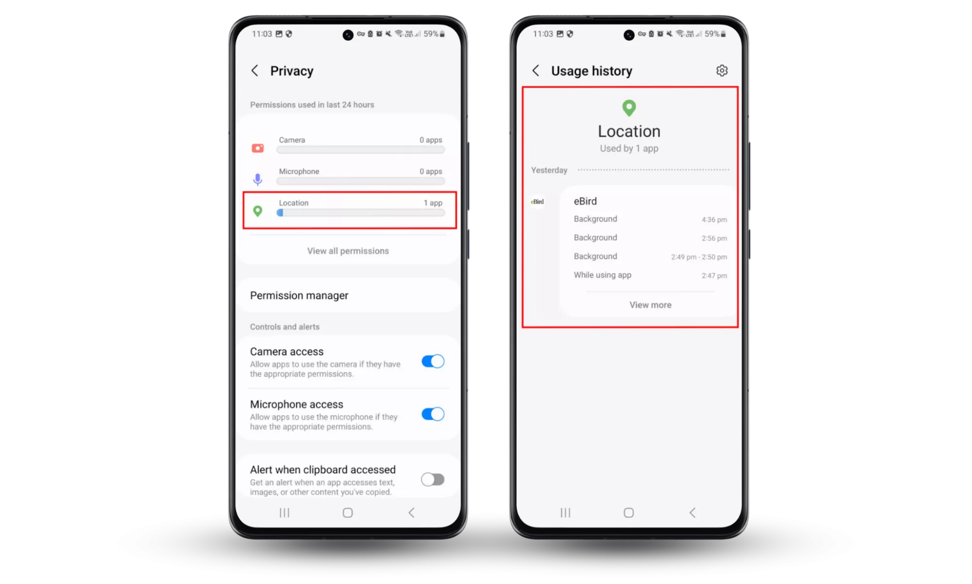 - Veți vedea o secțiune în partea de sus a ecranului care spunePermisiuni utilizate în ultimele 24 de ore. Aici, atingețiLocaţie.