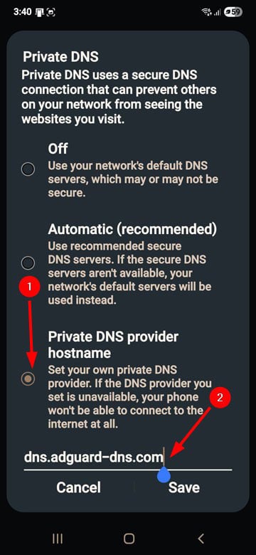 - RobinetDNS privat, selectațiNume de gazdă a furnizorului DNS privatși adăugați una dintre următoarele adrese DNS.