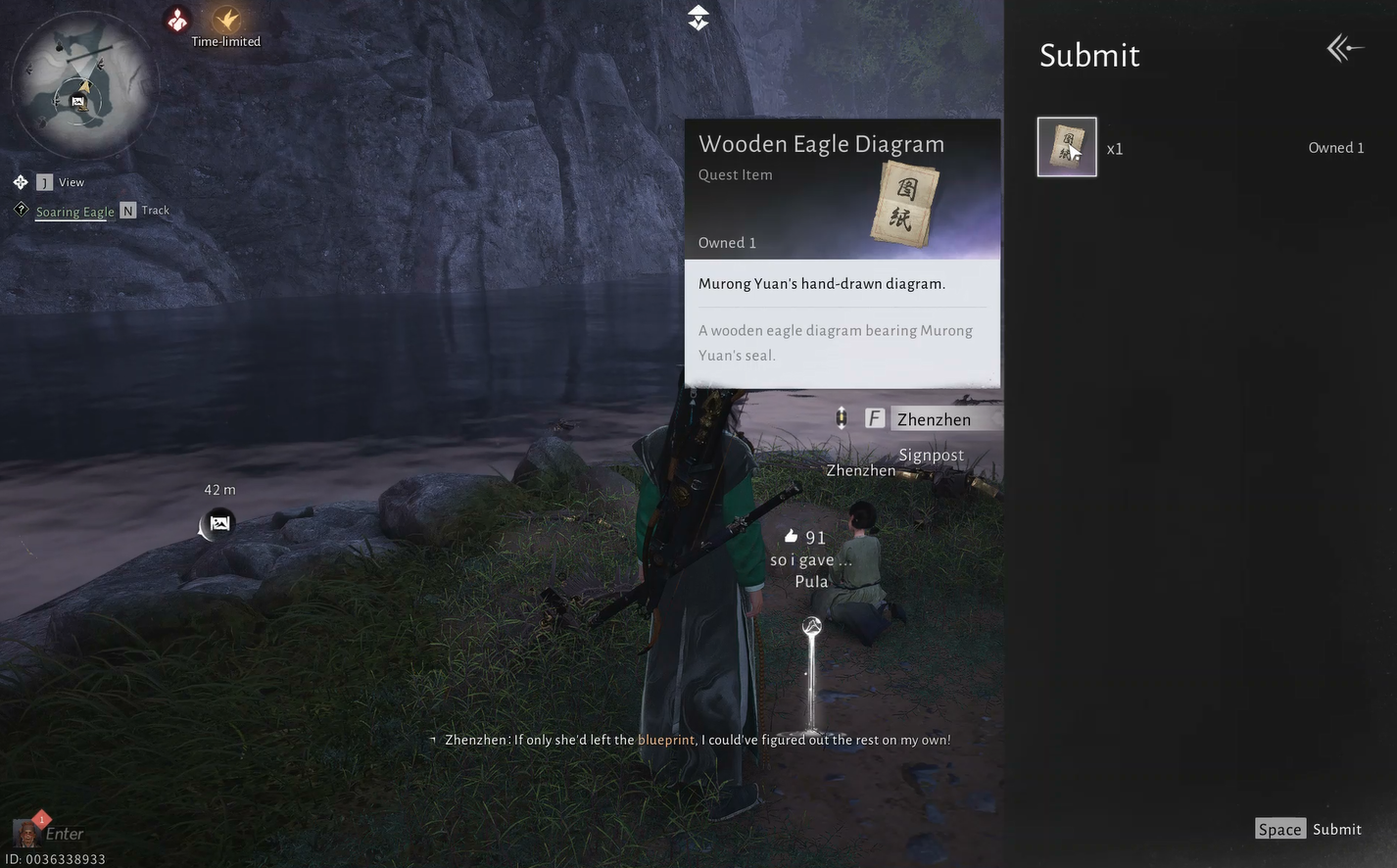 Odată ce a trecut o zi adevărată, întoarceți-vă la Jade Mirror Pond. Veți găsi acum o fetiță pe nume Zhenzhen lângă malul râului. Apropiați-vă de ea pentru a începe misiunea Întâlnirea cu Vulturul în vânt.