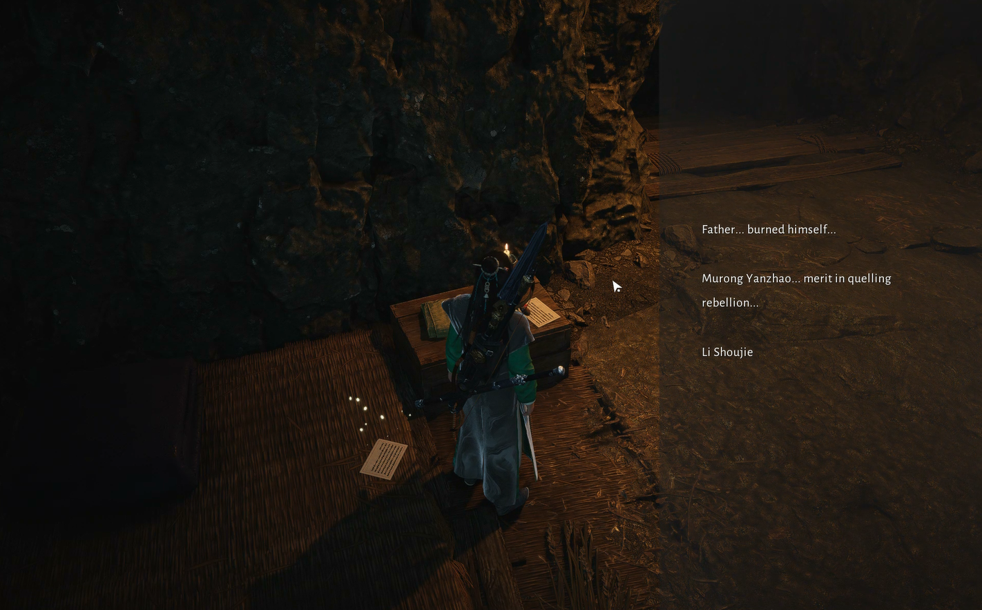 Supărat, Zhenzhen fuge. Urmăriți și vorbiți cu ea. Ea dezvăluie partea mai blândă a lui Murong Yuan și vă îndeamnă să investigați cine este cu adevărat Murong. Ea sugerează să vorbească cu localnicii și menționează că l-a văzut pe Murong lângă grămada de vechituri din afara cătunului, un loc despre care crede că ascunde baza secretă a lui Murong.