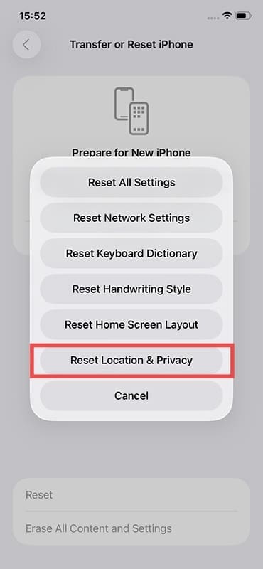 Pasul 3.Atingeți „Resetați” și alegeți „Resetați locația și confidențialitatea”.
