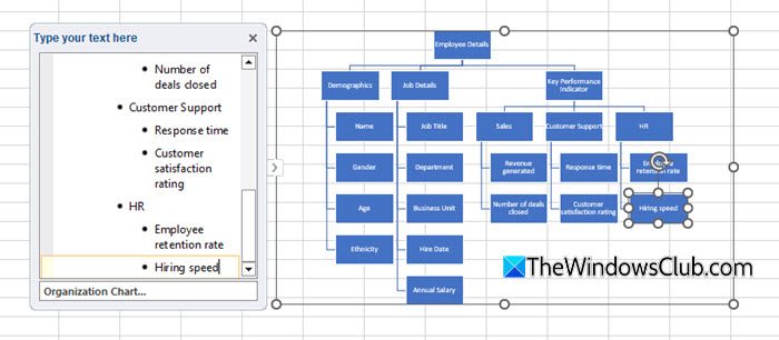 Tastați „Detalii despre angajat (acesta va fi subiectul central). PresaIntrăpentru a adăuga o nouă linie. PresaTabînainte de a tasta pentru a crea un sub-nivel (ramură). Pe măsură ce tastați, veți vedea că SmartArt va ajusta și formata automat ierarhia.