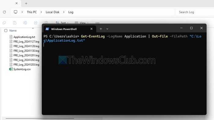 Get-EventLog -LogName Application | Out-File -FilePath "C:\Log\ApplicationLog.txt"