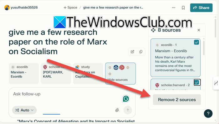 Rezultatul va fi din surse variate. Cu toate acestea, dacă cercetați, trebuie să cunoașteți sursele. Pentru a face acest lucru, puteți face clic pe butonul Surse pentru a obține o listă de surse în partea dreaptă a ferestrei. Dacă doriți să accesați aceste surse, faceți clic pe ele și veți fi redirecționat. În cazul în care nu vă place o resursă, puteți să o eliminați bifând caseta de selectare și făcând clic peEliminați sursa.