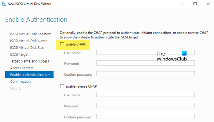 - Următorul pas este configurareaCHAP (Protocol de autentificare Challenge-Handshake)pentru securitate suplimentară între ținta iSCSI și inițiatori. Selectați una dintre cele două opțiuni și faceți clic pe Următorul.