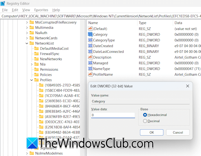 Extindeți folderul Profiluri din partea stângă. Veți vedea toate profilurile de rețea prezente pe sistemul dvs. Acum, aflați profilul de rețea corect. Selectați toate folderele unul câte unul și citiți numele profilului din partea dreaptă. Numele profilului este numele WiFi. Când găsiți profilul potrivit, faceți dublu clic peCategorievaloarea din partea dreaptă și introduceți una dintre următoarele valori conform cerințelor dvs.: