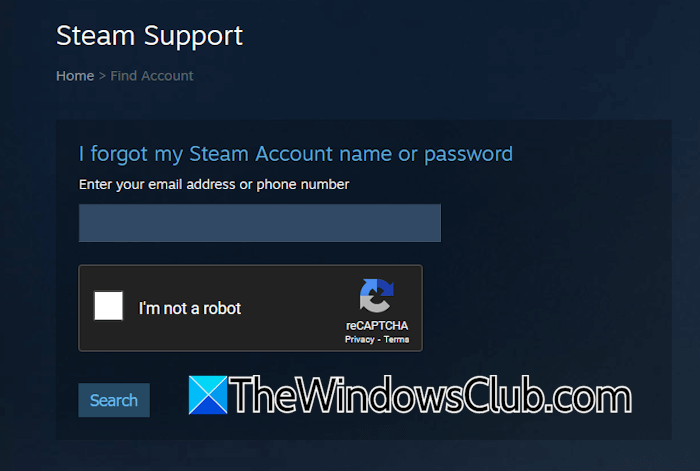 - Introdu adresa de e-mail sau numărul de telefon asociat contului tău Steam și dă clicCăutare.