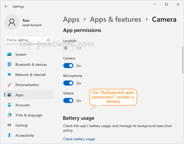 Apps -> Apps & features, kommer du att upptäcka att "Behörigheter för bakgrundsappar”-inställningen för alla appar försvinner.