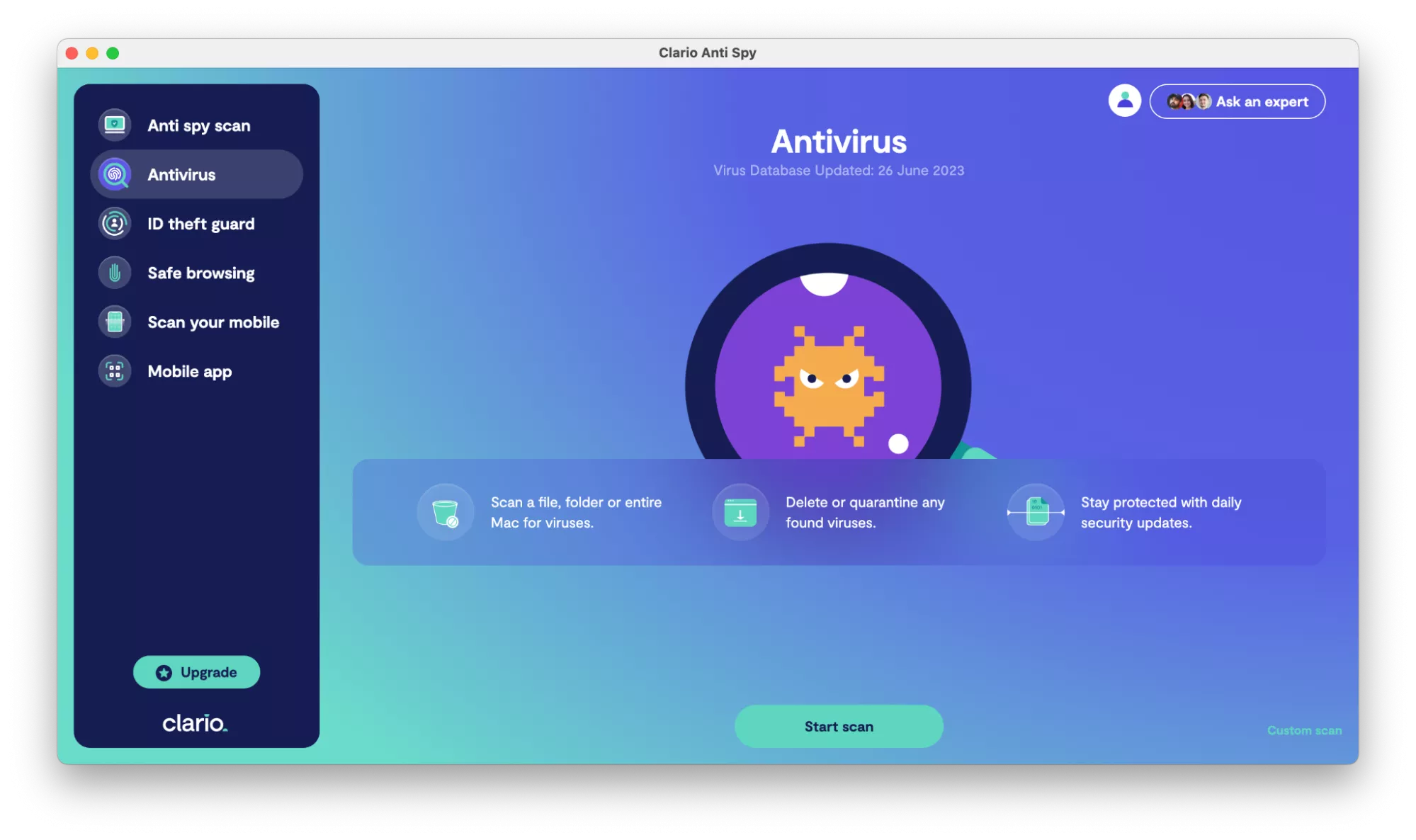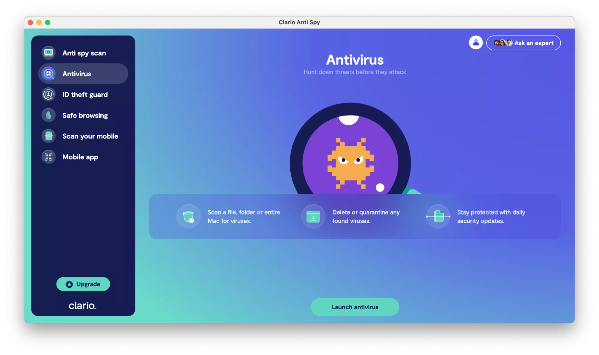 Lämna inget åt slumpen. Skydda din konfidentiella information från cyberbrottslingar som Amazon-bedragare. Investera i ett pålitligt antivirusprogram. Antivirusverktyget från Clario AntiSpy hjälper dig att skydda dig från virus och skadlig programvara som kan äventyra din integritet.