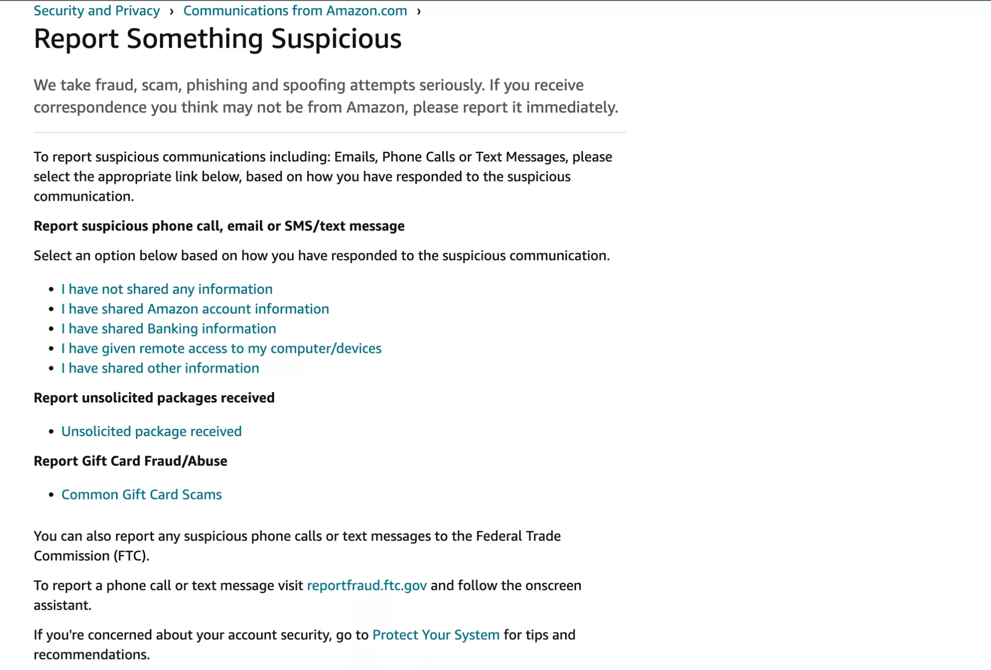 Amazon vill veta om alla nätfiske och Amazon-spoof-e-postmeddelanden, bedrägerier och annan bedräglig aktivitet som du kan ha upplevt som du tror kan komma från dem. Gå tilloch klicka på lämplig länk för att rapportera händelsen.