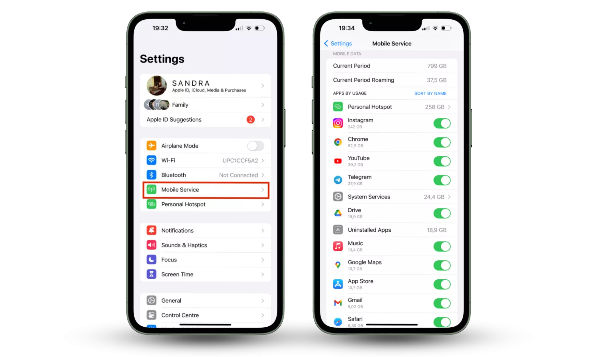 Steg 1-2. Inställningar> Mobiltjänst> svep nedåtSå här kontrollerar du dataanvändning på Android: