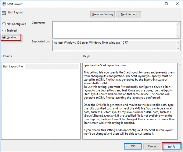 Steg 5: Välj Disabled or Not Configured och klicka på Apply följt av OK.
