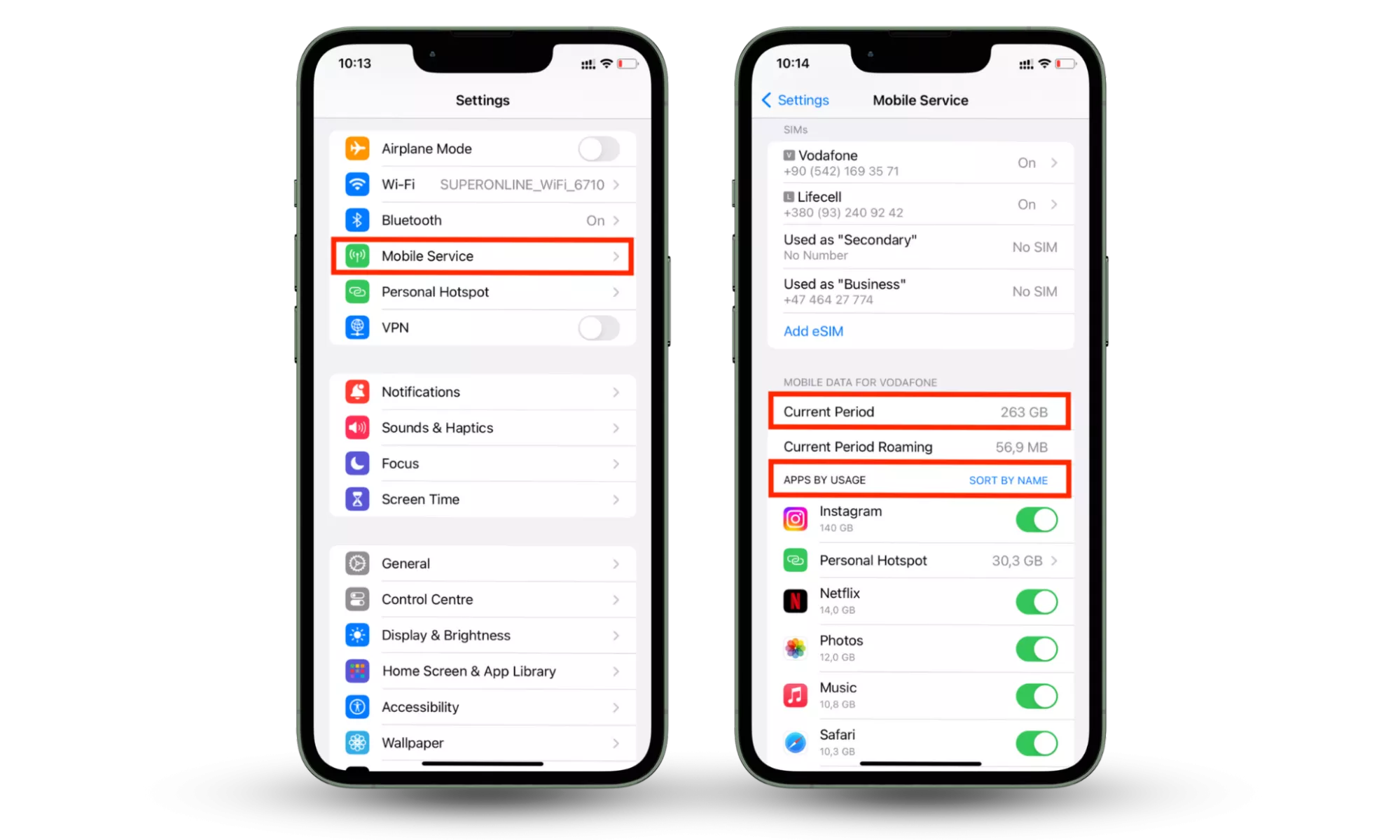 - Gå till avsnittet Mobildata för att kontrollera dataanvändning förNuvarande period. Kolla ocksåAPPAR EFTER ANVÄNDNINGför eventuella ovanliga toppar i dataanvändningen bland dina appar.