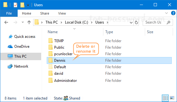 - Öppna nu Windows Utforskaren och bläddra till mappen C:\Users. Ta bara bort motsvarande användarprofilmapp eller byt namn på den till något annat om du inte vill förlora dokument och filer på skrivbordet.