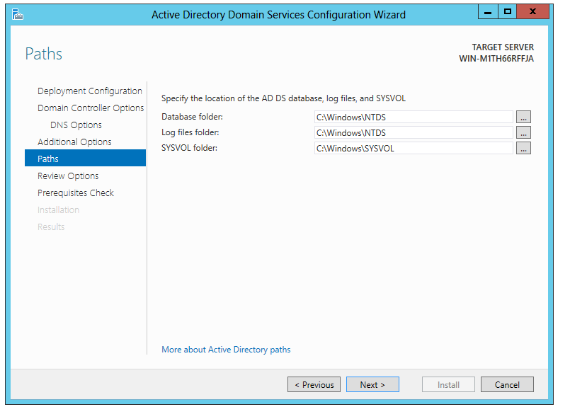 - Påstigarsida verifiera de önskade platserna för databasen, loggfilerna och SYSVOL-mapparna, ändra de platser som krävs, klicka på Nästa.