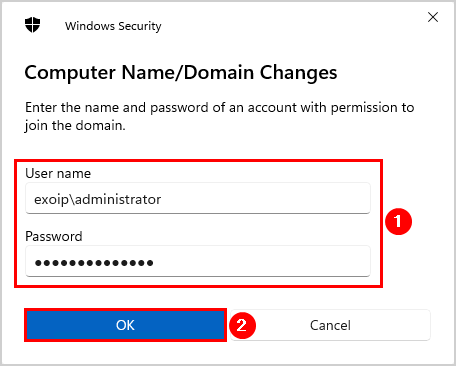 Add-Computer -DomainName "exoip.local" -Credential "exoipadministrator" -Restart- Ange administratörslösenordet
