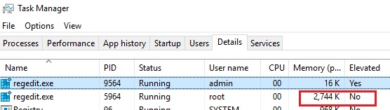 Registerredigeraren bör starta utan en UAC-prompt och utan att ange ett administratörslösenord. Om du öppnar Aktivitetshanteraren och lägger tillUpphöjdkolumnen kommer du att se att det finns regedit.exe-processen utan den förhöjda statusen (kör med icke-admin användarbehörigheter).