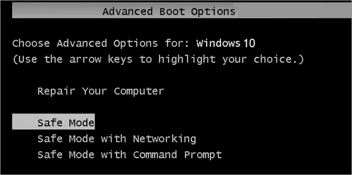 Steg 1Starta/starta om din dator, tryck omedelbart och håll ner F8 tillsAvancerade startalternativvisas och välj sedanSäkert lägeatt börja.