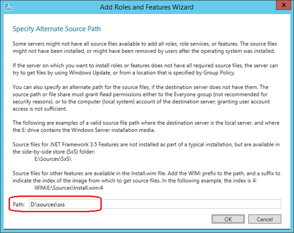 - Om din dator inte har någon internetanslutning måste du ange den alternativa källsökvägen. Klicka påAnge en alternativ källkodlänken längst ner på skärmdumpen ovan. Ange sedan sökvägen till källfilerna från installations-CD:n för Windows Server 2012.
