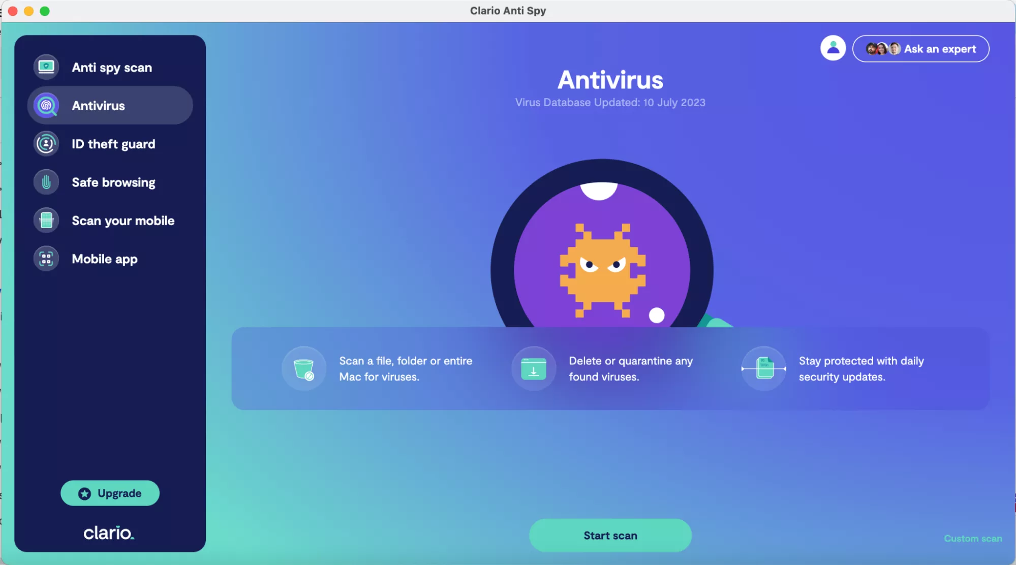 Använd Clario AntiSpyAntivirusverktyg för att leta efter spionprogram och andra hot på din Windows- eller Mac-enhet. Det är ett säkert och användbart verktyg från antispionappen Clario AntiSpy som ständigt kontrollerar din bärbara dator efter hot och eliminerar dem för att skydda din data och integritet. Syftet är att begränsa effekten av virus och skadlig programvara på din enhet.
