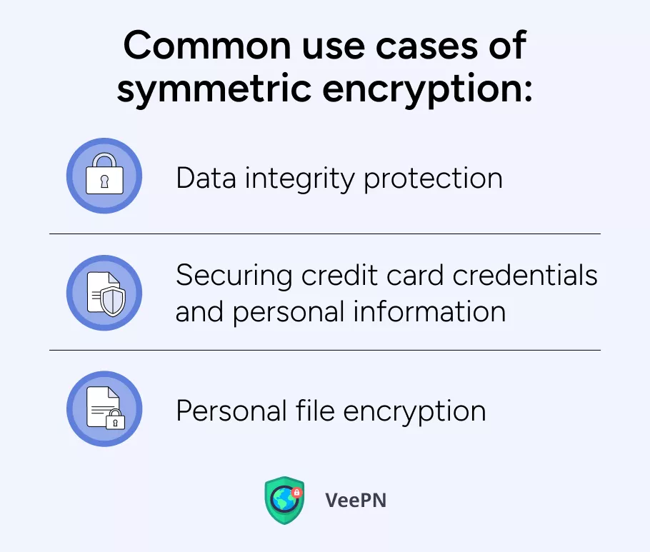 - Dataintegritetsskydd.Symmetrisk kryptering är perfekt för att skydda data som lagras på enheter och olika hårdvara men går online. Den här typen av kryptering säkerställer att data är säker i sin lagring och kan säkert färdas över nätverk utan risker att fångas upp och knäckas.
