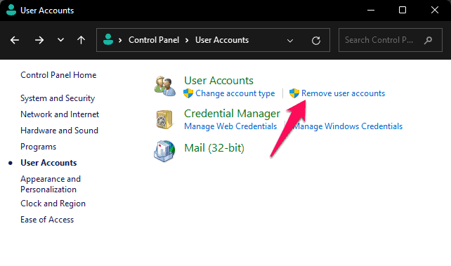 Ta bort användarkonto med kontrollpanelen