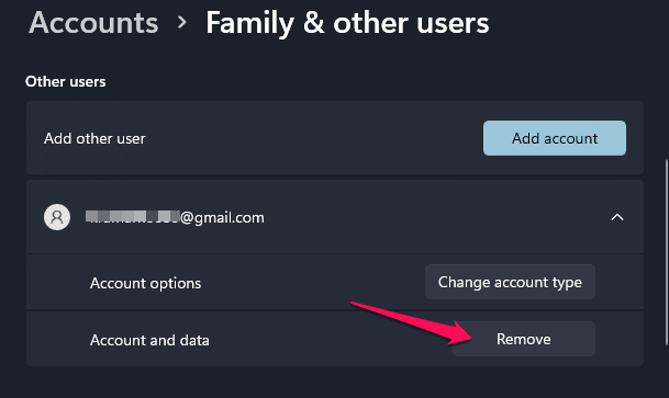 - Alternativt kan du ta bort ett användarkonto med alternativet Inställningar i Windows 11 genom att navigera till Konton, välja användarkontot och klicka på Ta bort konto och data.
