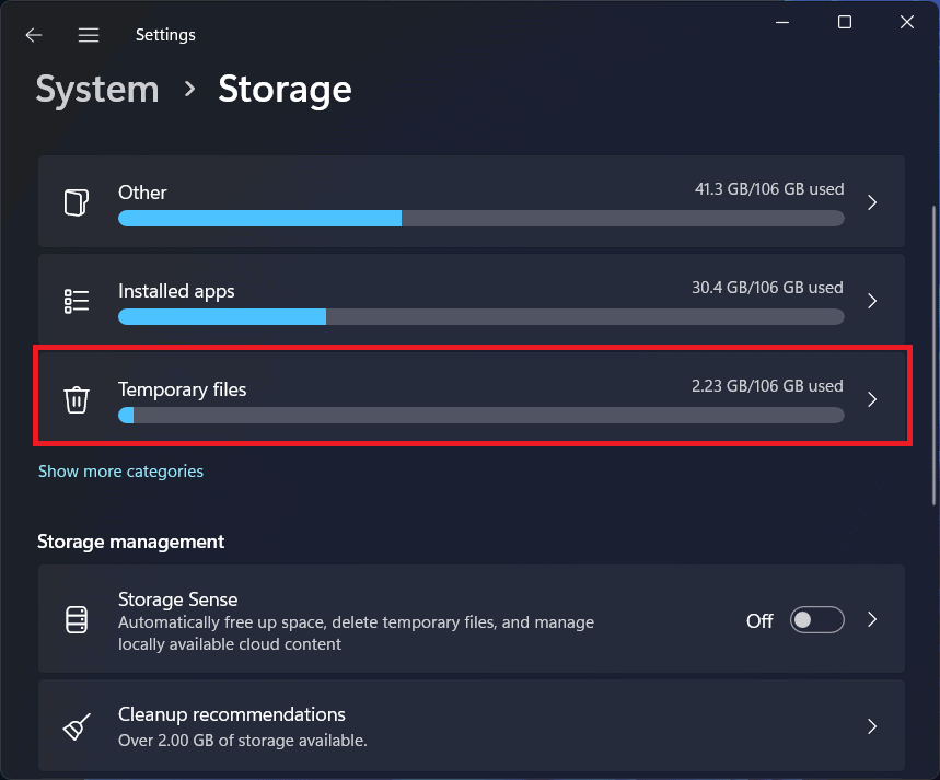 - UnderSystemfliken, klicka påLagringalternativ.