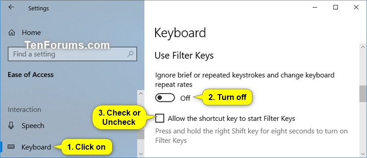 Det har rapporterats av flera Windows 10-användare att felet Tangentbord inte fungerar åtgärdas när filtertangenterna stängs av. Följ stegen nedan för att göra det.