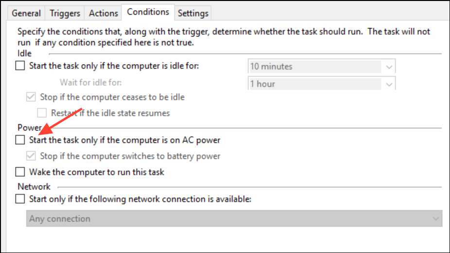 Steg 5:I fönstret Egenskaper för uppgiften, navigera tillVillkorflik. Granska inställningarna här, eftersom de kan förhindra att en uppgift körs. Om du till exempel använder en bärbar dator, avmarkera rutan förStarta uppgiften endast om datorn är på nätström. Du kanske också vill avmarkera andra villkor relaterade till att datorn är inaktiv eller nätverkstillgänglighet om de inte är relevanta för din uppgift.