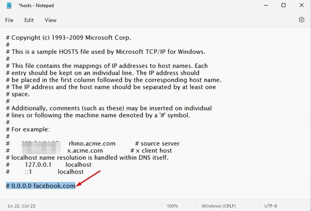 Ovanstående rad kommer att blockera Facebook-webbplatsen på din enhet. Du kanlägg till så många webbplatser som du vill i värdfilen. Webbadressen ska visas efter 0.0.0.0