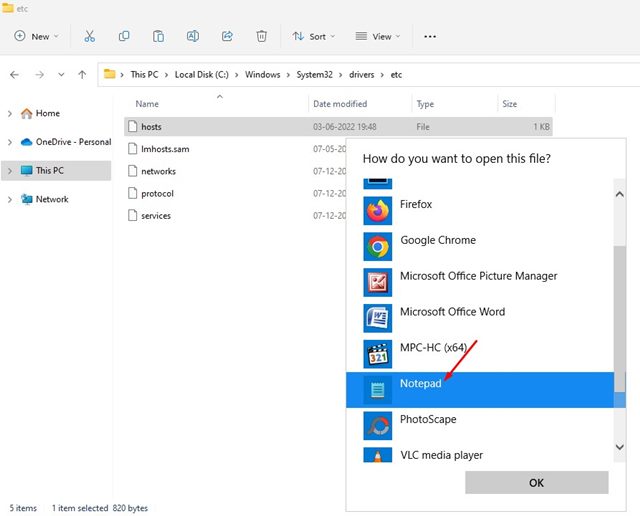 Innan du redigerar Hosts-filen,kopiera originalfilen till en säker plats. Dubbelklicka på Hosts-filen och väljAnteckningsblockatt öppna den.