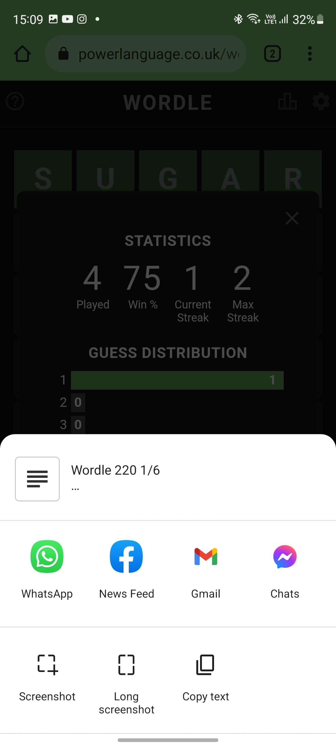 Om du spelar spelet på din telefon och vill dela Wordle-resultaten på Facebook eller någon annan app med din telefon, så har du också möjlighet att göra det. För att dela Wordle-resultat på Facebook eller någon annan app på din telefon, följ stegen nedan-