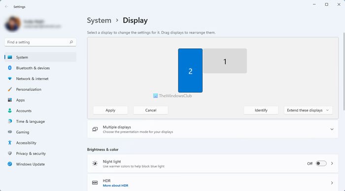 Ibland finns det ett mindre problem men vi är inte medvetna om det. Du kanske har valt en annan upplösning för dina skärmar. Kontrollera detta i Windows 11-inställningar. Öppna Windows 11 Inställningar och väljSystem > Display. Om båda dina skärmar har olika upplösning, kommer du att se olika storlekar för dina skärmar (se skärmdumpen ovan). Välj nu en bildskärm och ändra dess upplösning manuellt.